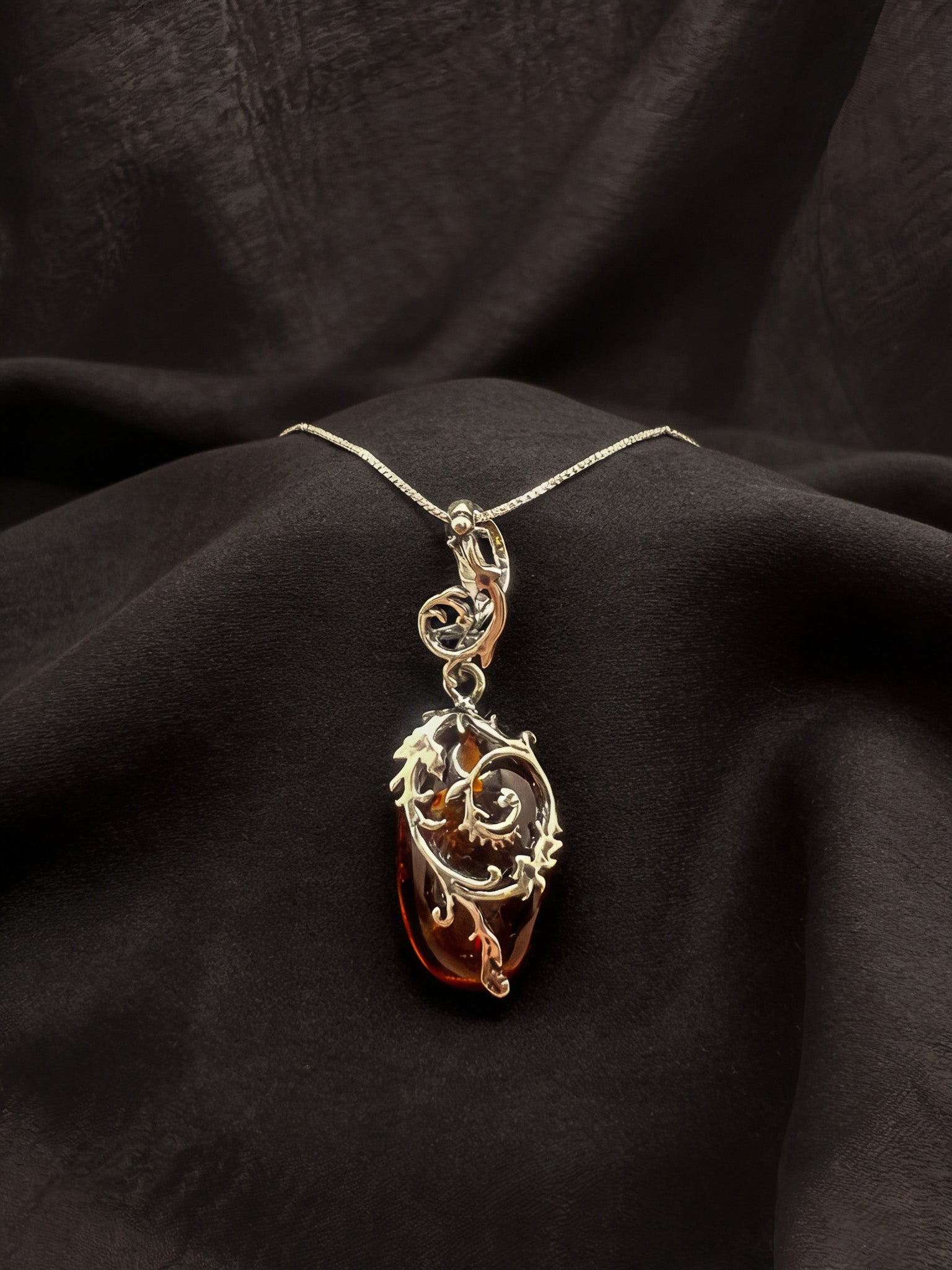 Amber pendant with sterling silver vine design. Chain sold sperately.