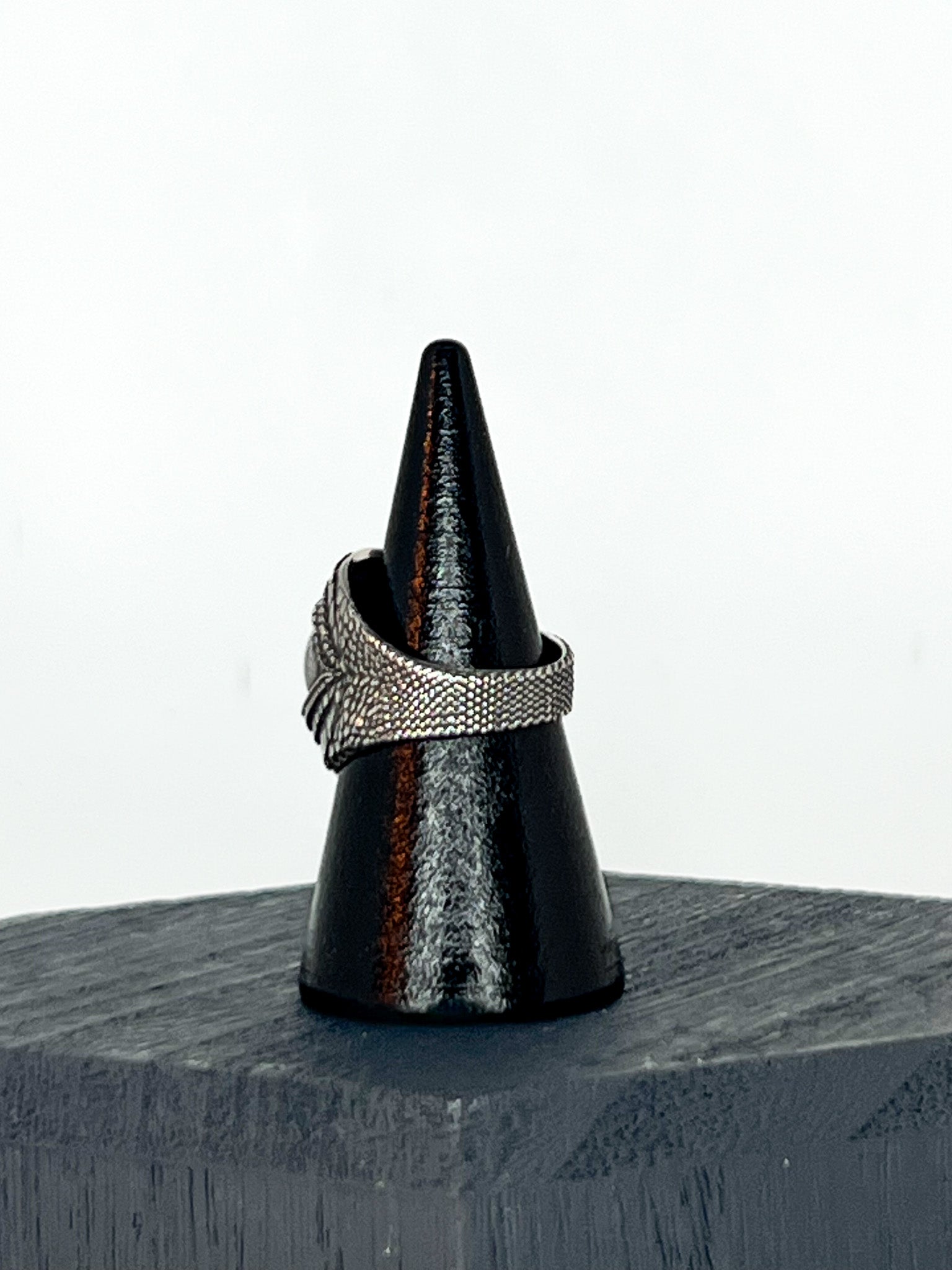 Heavy sterling silver large ring featuring a dragon eye design that reaches around to the back of the ring.
