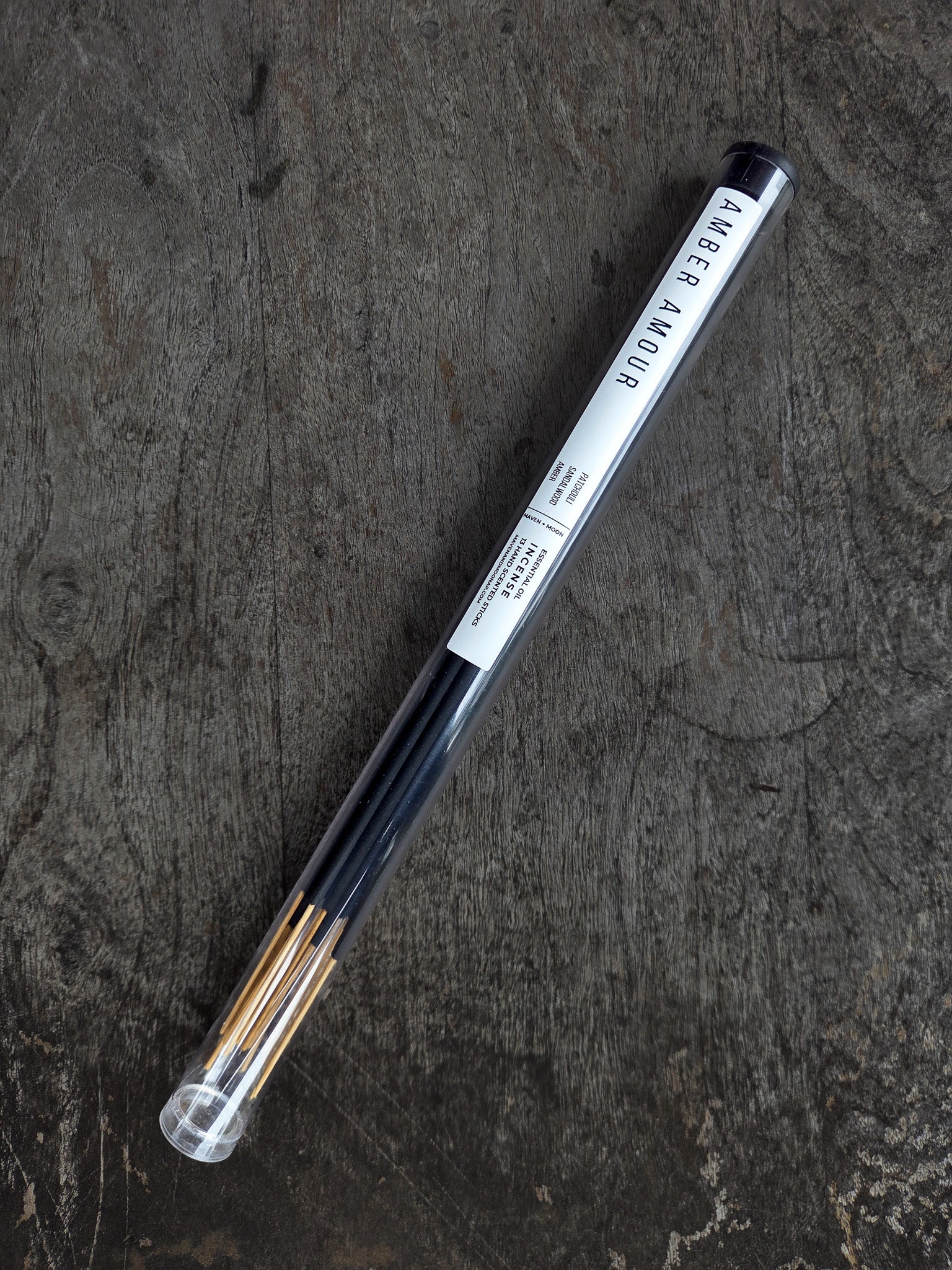 Our Natural Hand-Scented Incense Sticks, are meticulously crafted for those who seek a genuine aromatic experience. Each stick is lovingly infused with our custom-blended essential oils, ensuring a fragrance as pure and natural as the ingredients themselves, which provide a pure and clean scent that won't overwhelm your senses or cause your head to pound. Our incense sticks are designed to offer a gentle, soothing aroma that uplifts your space without overpowering it. __ AMBER AMOUR __ Vibe: sensual, warm, alluring __ Use for: passion, intimacy, heart-opening __ Scent: ylang ylang + patchouli + amber {Sweetly floral, smoky, and golden-resin rich} >PRODUCT INFO ¥ QUANTITY: 13 incense sticks ¥ BURN TIME: 45-60 minutes ¥ CONTAINER: Sealable plastic tube - 10.6 inches long, 0.7 inches in diameter >INGREDIENTS ¥ Sticks are made of all-natural Joss Powder (Litsea Glutinosa) Bamboo (Bambusa Arundinacea) and fragranced with custom MAVEN + MOON essential oil blends and DPG (to inhibit sooting and distribute essential oils). ¥ No Synthetic Fragrance, Non-Toxic, Cruelty-Free ¥ Hand-scented Dallas, TX
