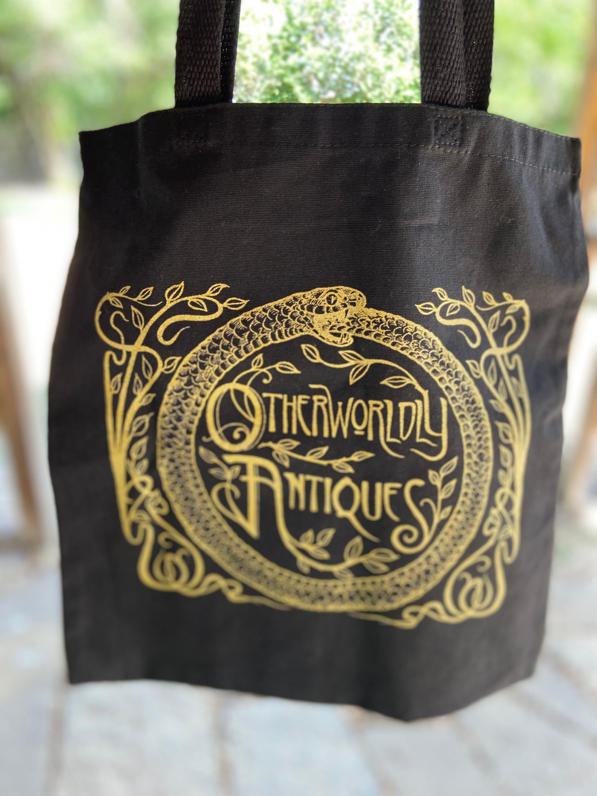 A sturdy black tote bag with "Otherworldly Antiques" in a gorgeous gold print. Encompassing it all is Ouroboros in Gold. 15.5 x 14 inches.