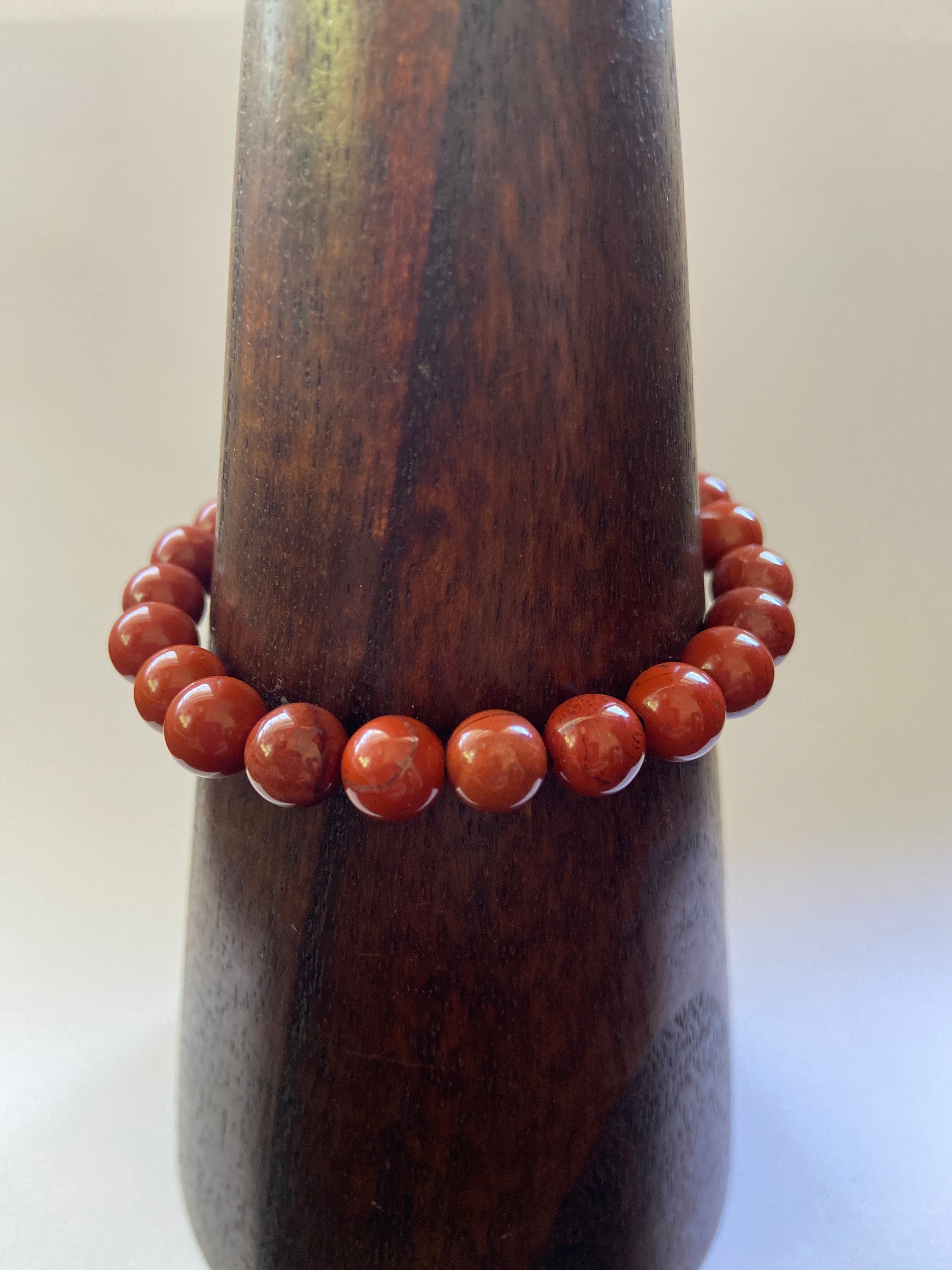 Crafted from smooth 8mm natural Red Jasper beads, this bracelet features rich earthy tones and a timeless design. Known as the Stone of Strength, Red Jasper is believed to promote grounding, balance, and resilience. Strung on a durable stretch cord for comfortable everyday wear, it’s perfect worn alone or stacked with other bracelets.