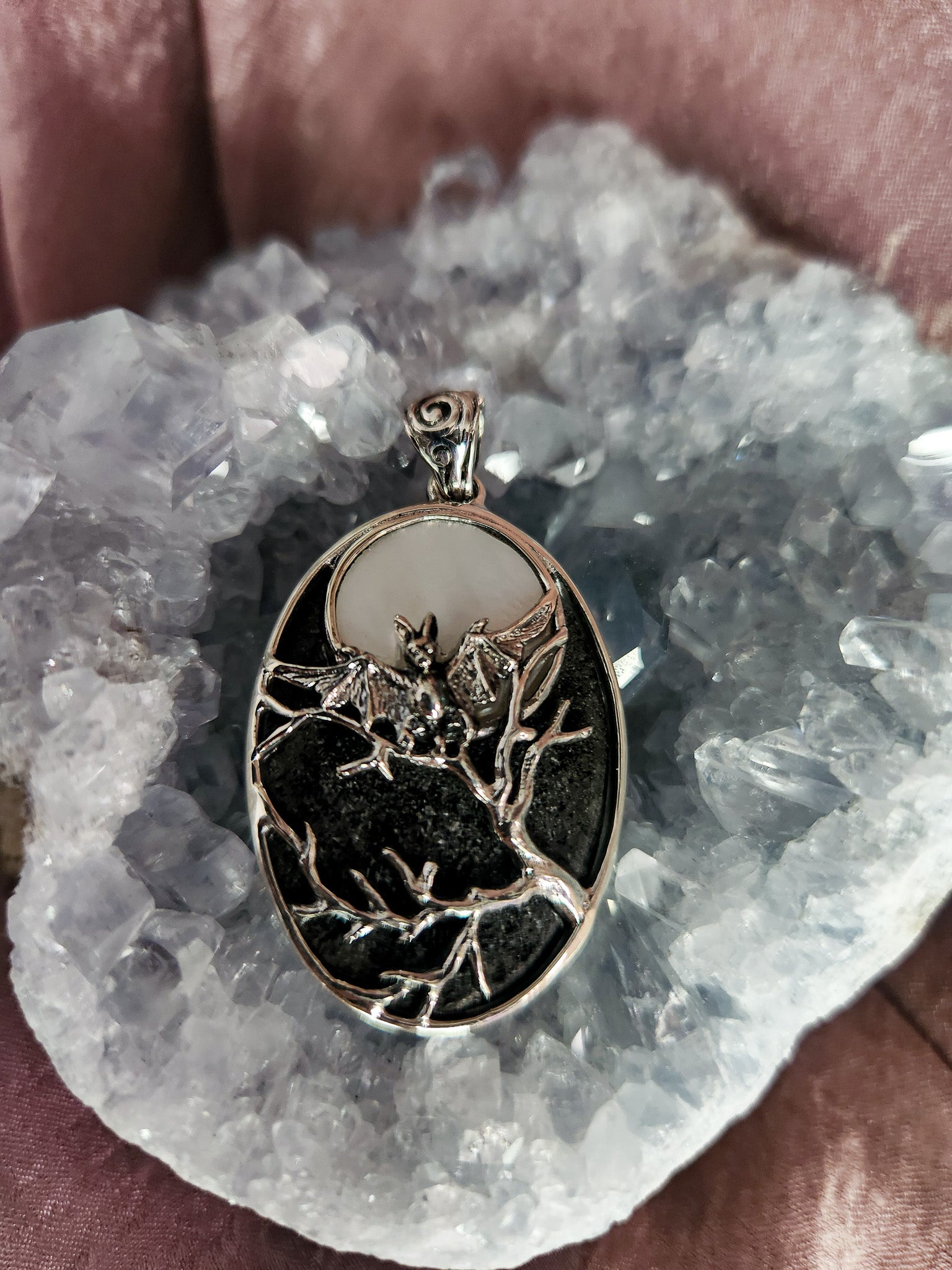 Sterling Silver Flying Bat in Mother-Of-Pearl Full Moon Pendant