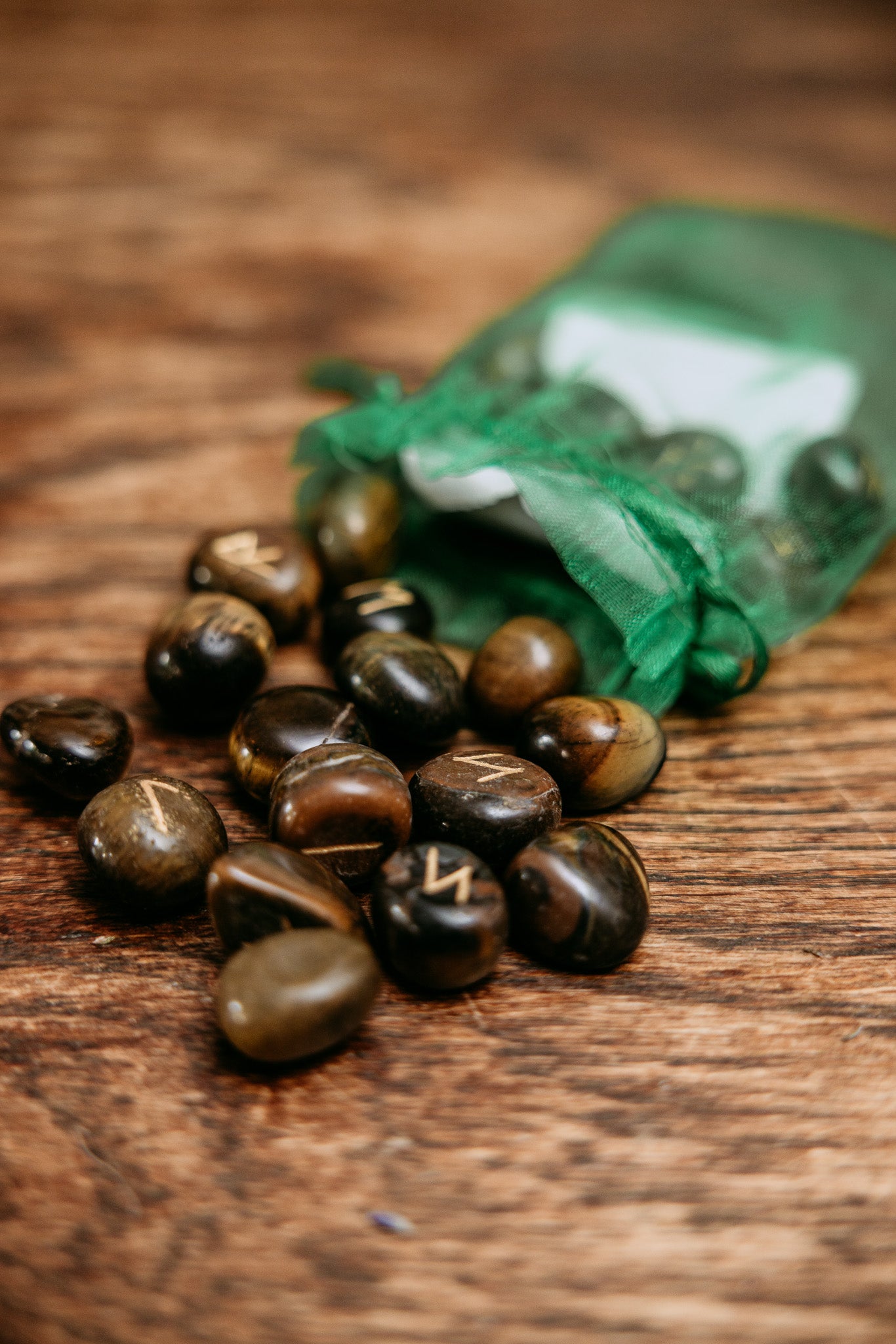 Tiger Eye is the gemstone of promoting Mental Balance and Intuition. Our Tiger Eye Gemstone Runes are beautifully carved 25 piece sets with engraved lettering and hand painted in gold. Comes in a velvet carry pouch with instruction pamphlet.